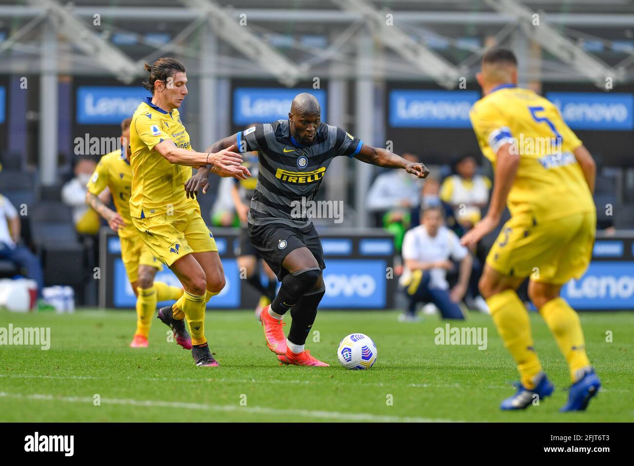 Milano Italy 25th April 2021 Romelu Lukaku 9 Of Inter Milan And Giangiacomo Magnani 23 Of Hellas Verona Seen In The Serie A Match Between Inter Milan And Hellas Verona At Giuseppe